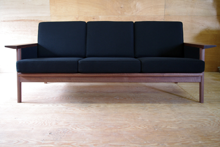 ![]() ■ 3SeaterSofa/ウォールナット/ W1850 D850 H700 360度、特に背面や側面のデザインが美しく仕上がった。上のソファーとはまた違ったアプローチでデザインしているが、共通しているのはやはり張込みの部分へのこだわり。本当にきれいに仕上がっている。毎度丁寧な仕事をしていただく椅子張り職人さんに感謝です。 |